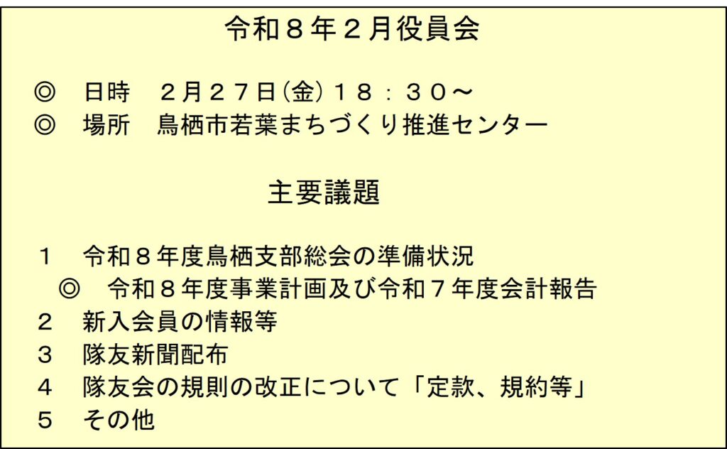 各地区のお知らせ X Facebook はてブ LINE コピー 2024.08.102025.12.29 目次 東部地区令和7年度業務予定(案)鳥栖支部令和7年12月の鳥栖支部役員会の議題令和8年2月の鳥栖支部役員会の議題(予定)中部地区南西部地区 東部地区 令和7年度業務予定(案) 鳥栖支部 令和7年12月の鳥栖支部役員会の議題 令和8年2月の鳥栖支部役員会の議題(予定) 中部地区 南西部地区