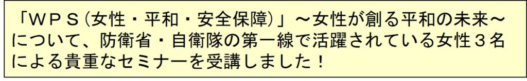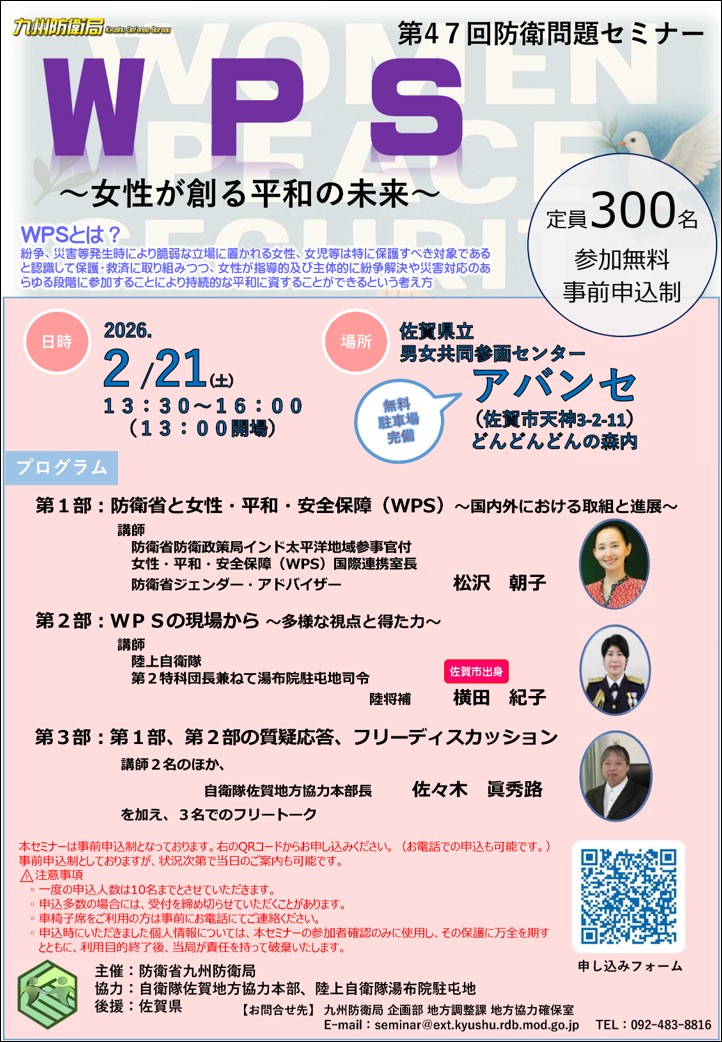 2月21日(土) 佐賀県で開催された「第47回防衛問題セミナー」に会員が参加 講演会等 X Facebook はてブ LINE コピー 2026.02.24 目次 「防衛問題セミナー」とは「第47回防衛問題セミナー」の案内ポスター参加した「中部地区副会長」の所見等セミナーの目次第1部 防衛省と女性・平和・安全保障「WSP」って知ってる?防衛省がWSPの推進に取り組む意義と必要性第2部 WPSの現場から(第2特科団長兼ねて湯布院駐屯地司令)受講して佐賀での初講演を大歓迎 「防衛問題セミナー」とは 「第47回防衛問題セミナー」の案内ポスター 参加した「中部地区副会長」の所見等 セミナーの目次 第1部 防衛省と女性・平和・安全保障 「WSP」って知ってる? 防衛省がWSPの推進に取り組む意義と必要性 第2部 WPSの現場から(第2特科団長兼ねて湯布院駐屯地司令) 受講して 佐賀での初講演を大歓迎 第2特科団長兼ねて湯布院駐屯地司令の横田陸将補(中央)